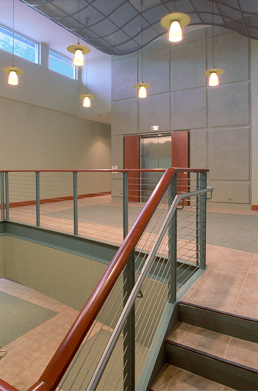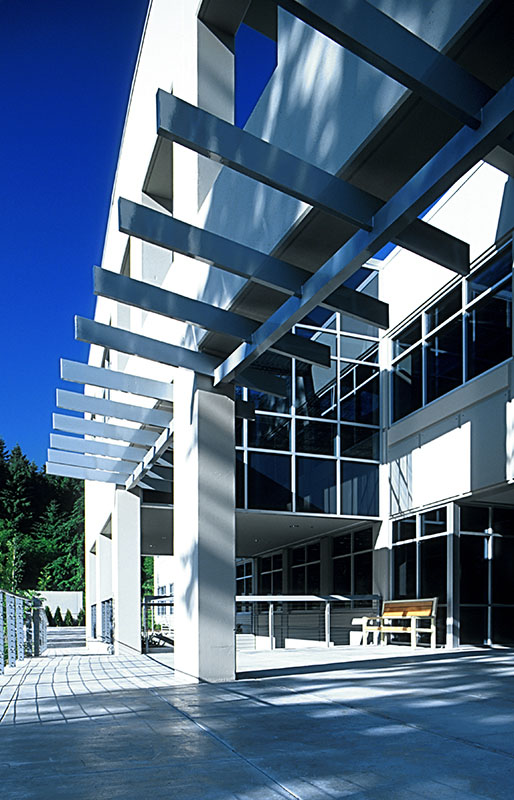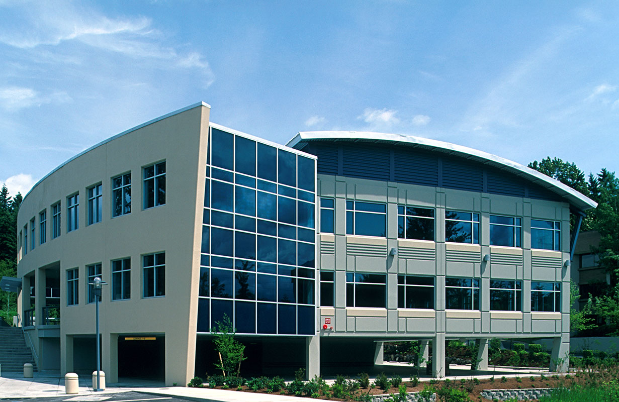 This contemporary 35,000 SF two-level office building features a creative response to a narrow, sloping site. Built on a wetland's edge and within curved driveways and city streets, the unique curved concrete entry façade draws visitors to the main doors beyond. A series of western openings—echoing the lower window shapes—wrap the façade. This building features the first use of curved tilt-up panels in the Northwest.